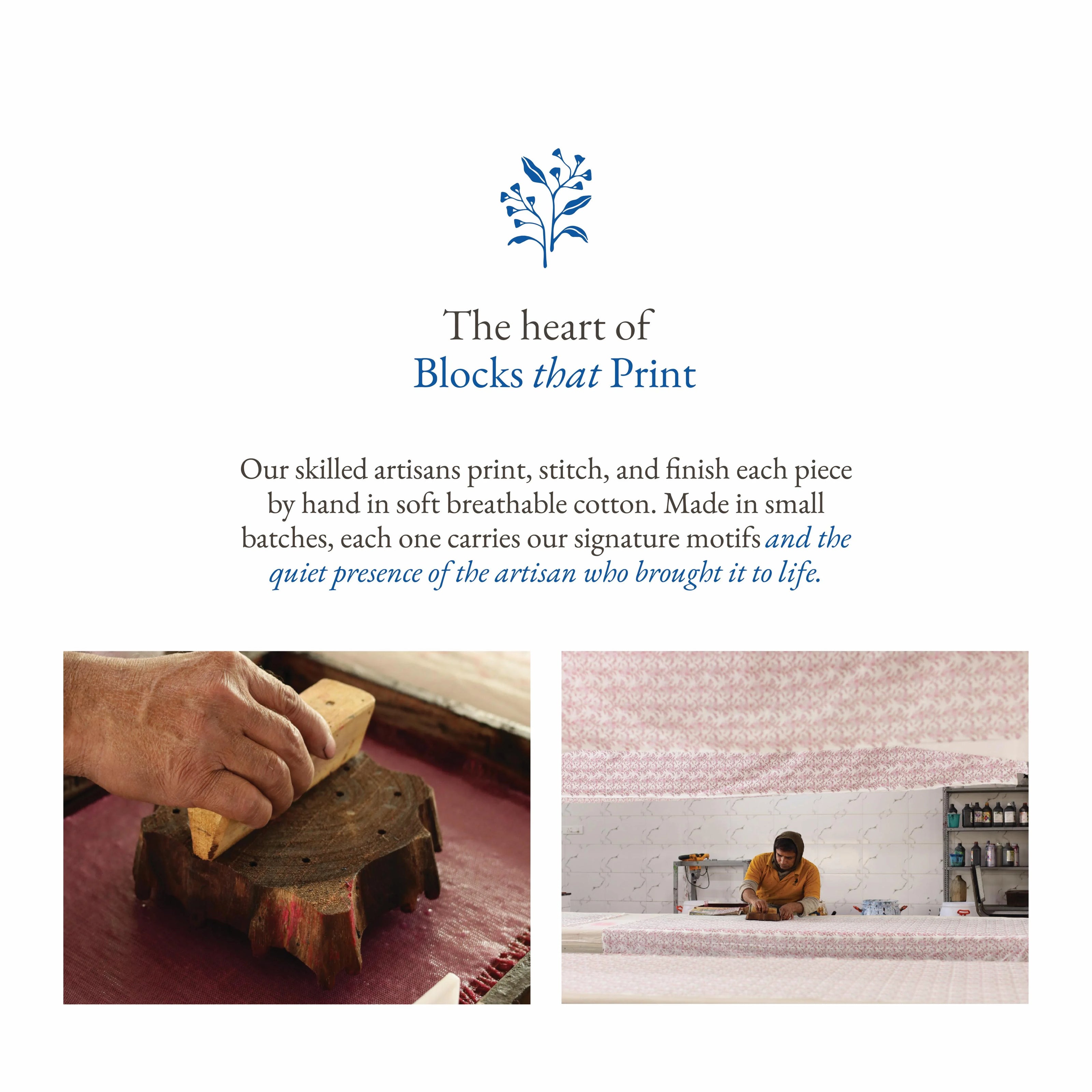 100% handmade on soft natural cotton - each piece carries our signature motifs and the quiet presence of the artisan who brought it to life.